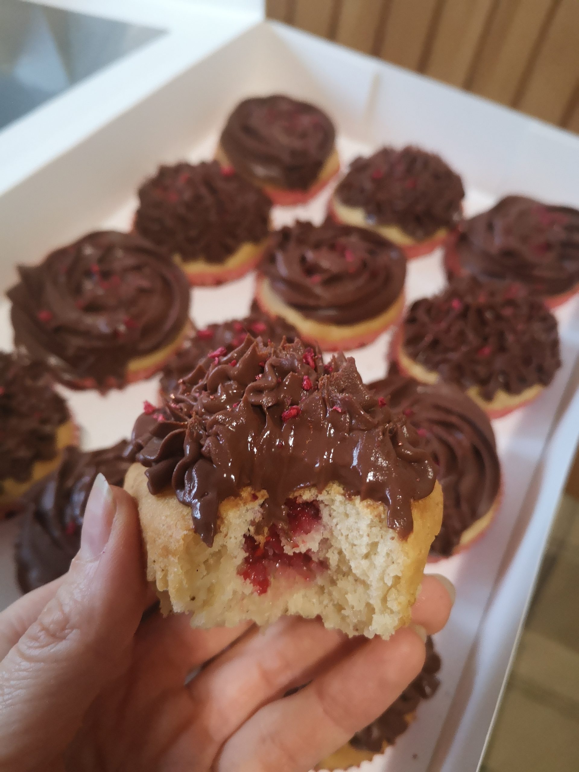 • Mandljevi kolački z malinami in čokoladnim ganachem